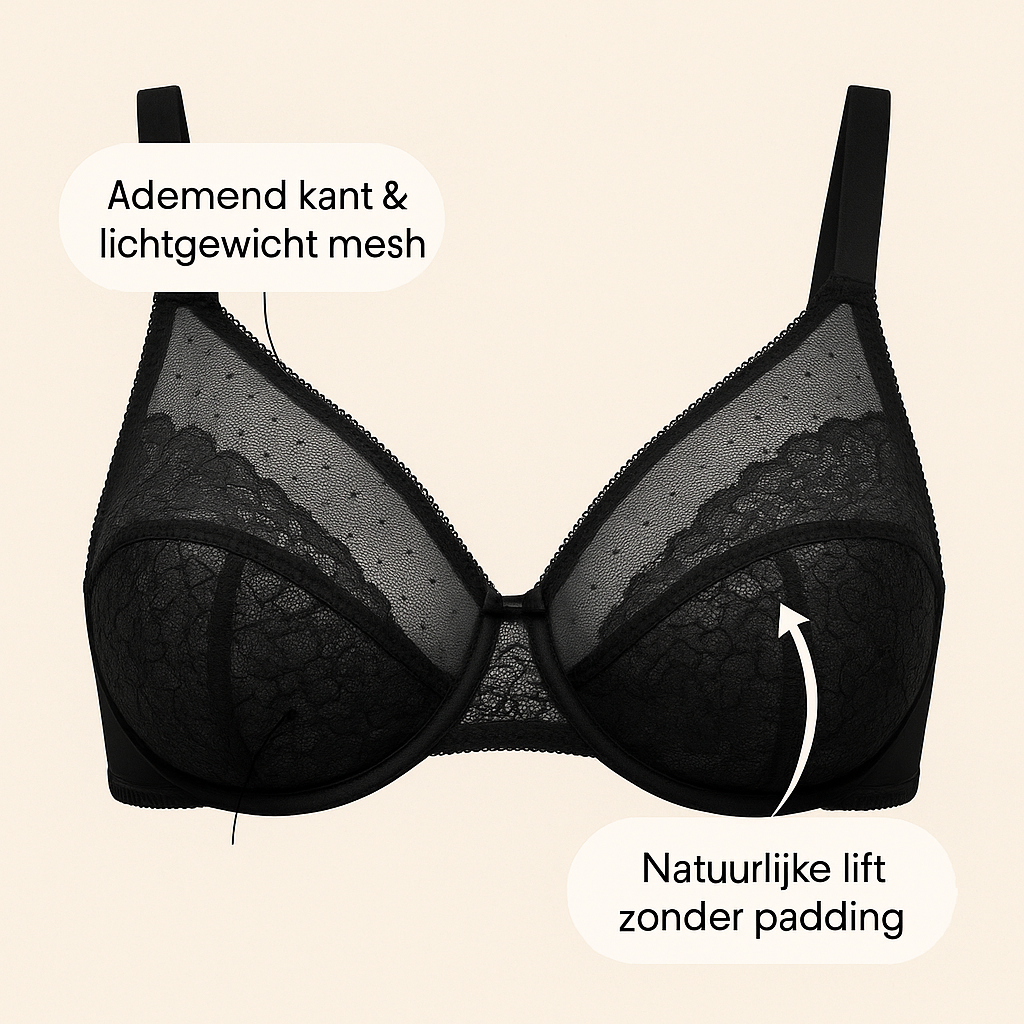 De ademende mesh cups en het zachte kant voelen luchtig aan op de huid, terwijl de stevige beugels en brede bandjes voor natuurlijke ondersteuning zorgen, ook bij een grotere cupmaat.
