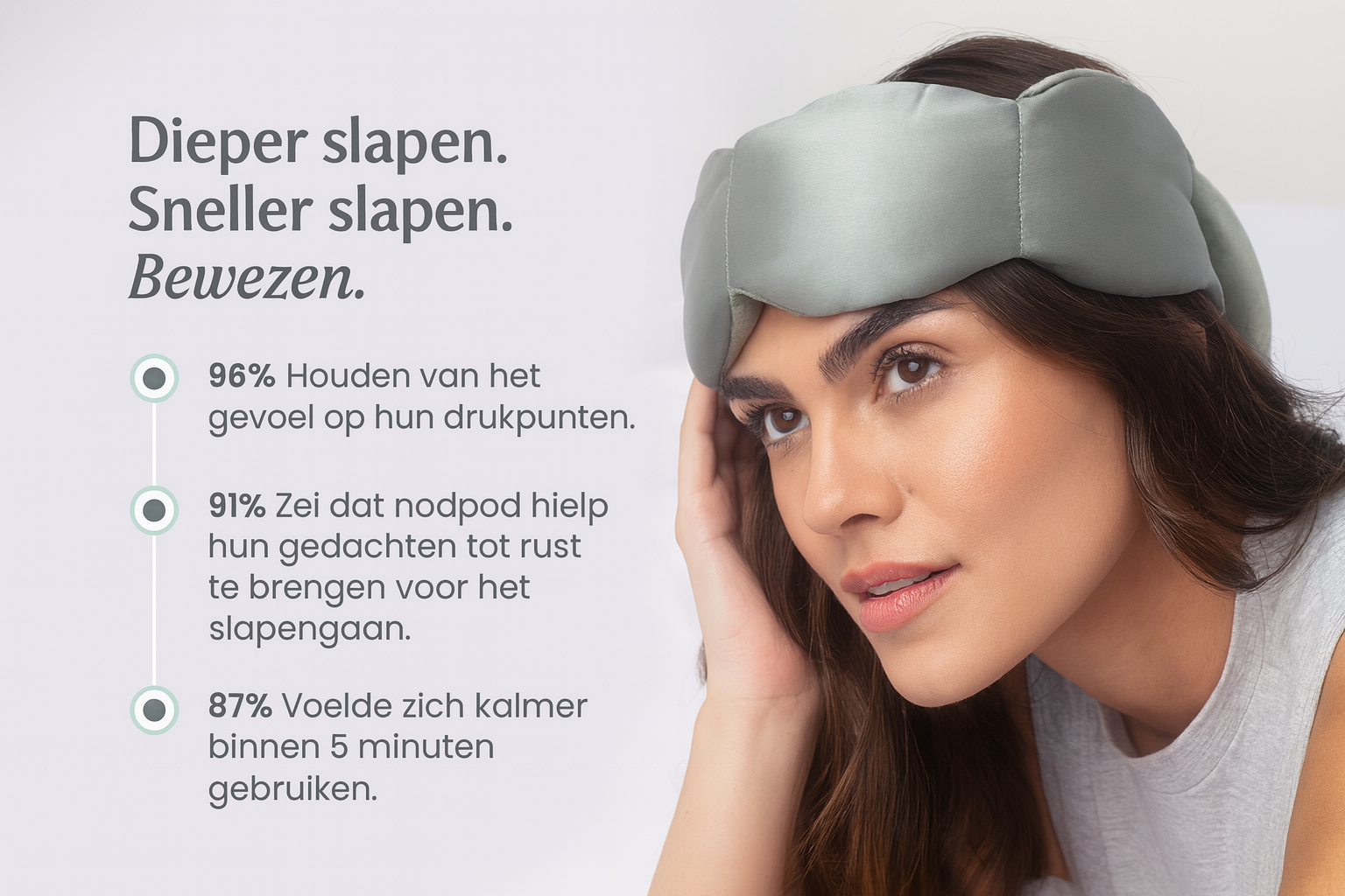 De Nodpod is geen gewoon slaapmasker, maar een verzwarende ontspanningstool die je lichaam en hoofd binnen enkele minuten tot rust brengt. De combinatie van natuurlijke kalmering, Deep Touch Pressure en de gerichte druk op belangrijke ontspanningspunten zorgt ervoor dat je sneller inslaapt, dieper ontspant en eindelijk weer uitgerust wakker wordt, zonder bandjes, zonder knelling, alleen pure rust.