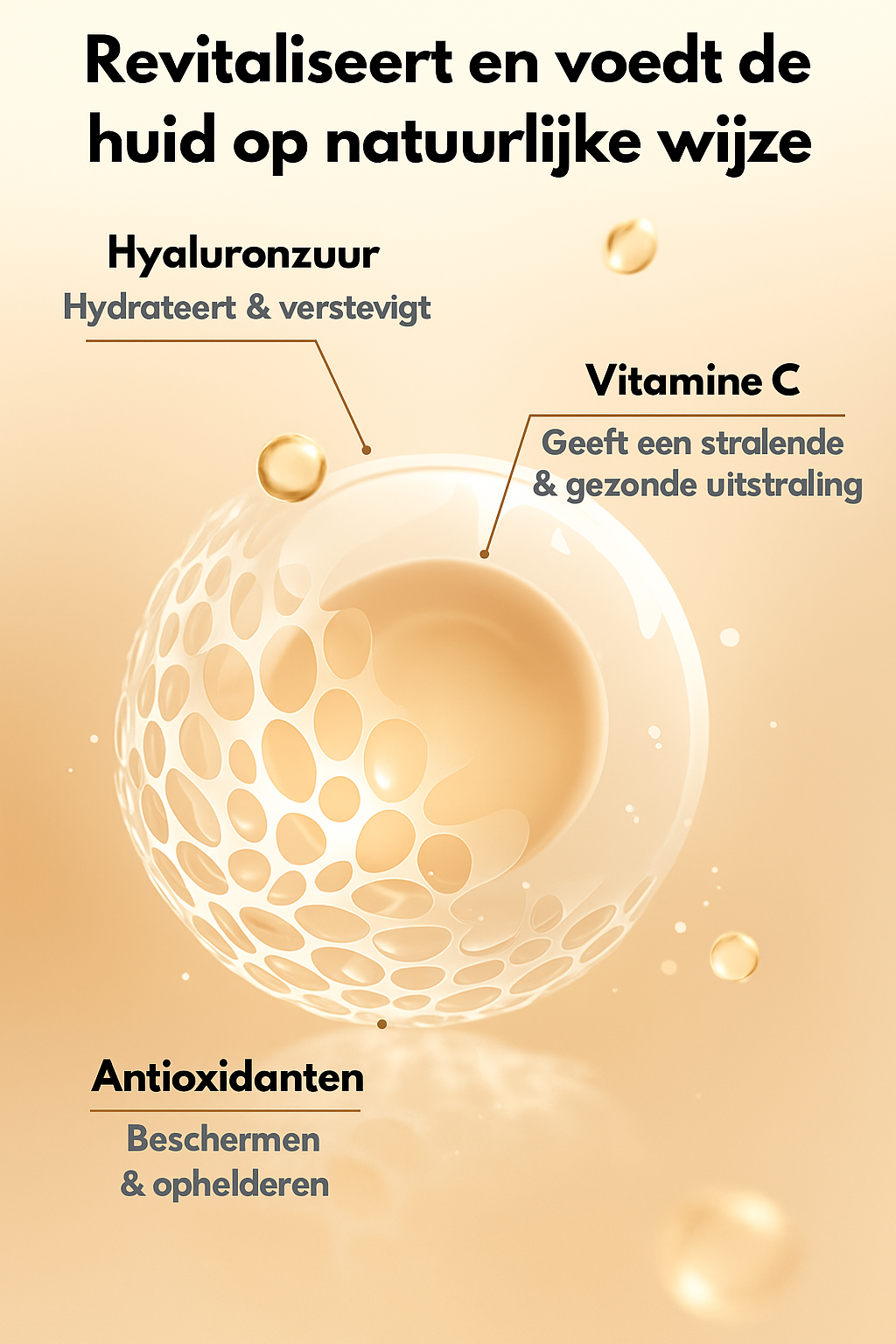 Hyaluronzuur houdt de huid glad en goed gehydrateerd, vitamine C helpt de teint egaler te maken, en antioxidanten beschermen tegen schadelijke invloeden van buitenaf.